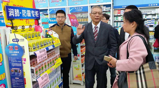 白云山潘高壽藥業董事長楊東升與老百姓大藥房連鎖采購中心總經理王琴察看雙方共建的潤肺防霾專柜