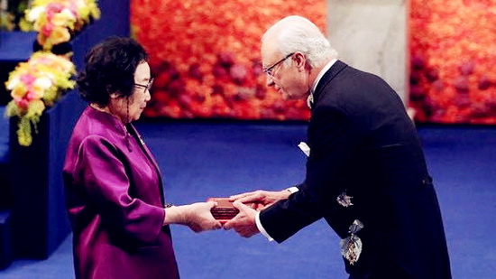 北京時間12月10日23時10分,2015年諾貝爾獎頒獎典禮在瑞典斯德哥爾摩音樂廳隆重舉行,屠呦呦從瑞典國王手中接過了諾貝爾生理學或醫學獎證書。