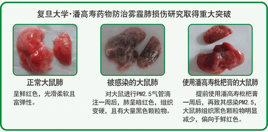 據悉,早在2013年,潘高壽就已經瞄準當下大熱的話題“PM2.5”, 攜手復旦大學公共衛生學院開展了國內首個PM2.5傷害防治研究項目。通過動物活體實驗研究發現潘高壽治咳川貝枇杷露和蜜煉川貝枇杷膏可抑制炎性因子與各種細胞內容物的分泌,促進細胞的愈合與生長,有效清除肺部垃圾,保護肺部組織,減少肺損傷。