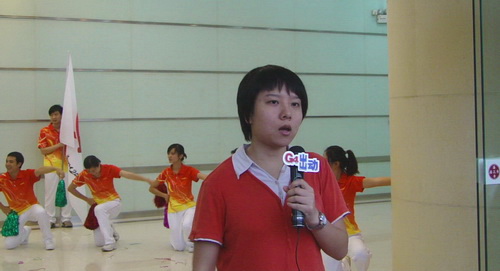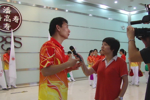 領(lǐng)操戎全剛向記者介紹助威操排練情況