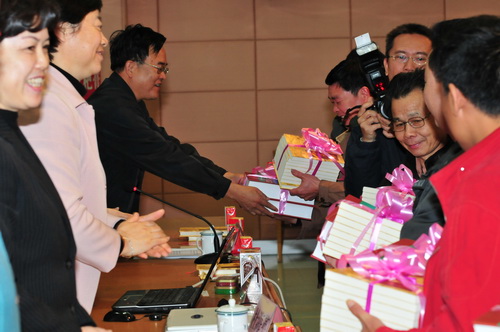 舉辦儀式的開(kāi)平市政府一號(hào)會(huì)議廳座無(wú)虛席,喜氣洋洋。市政協(xié)副主席杜海英、市委宣傳部副部長(zhǎng)關(guān)文蔭、市府辦副主任安超、我司黨委書(shū)記鄭楠、副總工程師盧其福在主席臺(tái)上就坐。儀式由市文廣新局副局長(zhǎng)譚法寧主持。市檔案局長(zhǎng)余英瑞、教育局副局長(zhǎng)胡麗萍、潘高壽公司資訊部經(jīng)理梁葆春、《生金記》作者林沃亮,負(fù)責(zé)儀式操辦的市志辦負(fù)責(zé)人、來(lái)自潘高壽發(fā)源地的月山中學(xué)校長(zhǎng)李溢南以及開(kāi)平市各鎮(zhèn)街的學(xué)校代表、“農(nóng)家書(shū)屋”代表、機(jī)關(guān)及企事業(yè)單位代表、離退休老同志代表等參加了儀式。