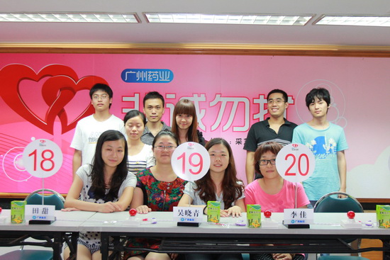 廣州藥業(yè)第一期“非誠勿擾”活動(dòng)在廣州采芝林藥業(yè)有限公司舉行,我司團(tuán)委與星群團(tuán)委負(fù)責(zé)前期報(bào)名整理工作,有24位女嘉賓、9位男嘉賓參與活動(dòng),最終有6對(duì)青年?duì)渴殖晒Α,F(xiàn)場130名親友團(tuán)和觀眾見證了她們情緣的開始,并用熱烈的掌聲表示支持和祝福!