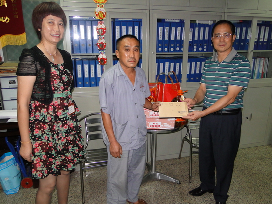 紀委書記工會主席梁志平向困難職工關新猷送上慰問金和慰問品