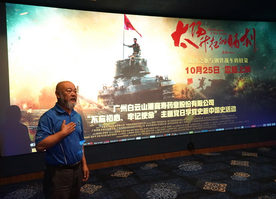 2019年11月15日,白云山潘高壽黨委組織開展“不忘初心、牢記使命”主題黨日學(xué)黨史新中國(guó)史活動(dòng),60余名黨員代表共同觀看了愛國(guó)主義電影《太陽(yáng)升起的時(shí)刻》,并邀請(qǐng)影片創(chuàng)作團(tuán)隊(duì)執(zhí)行監(jiān)制邢龍先生分享創(chuàng)作感受。